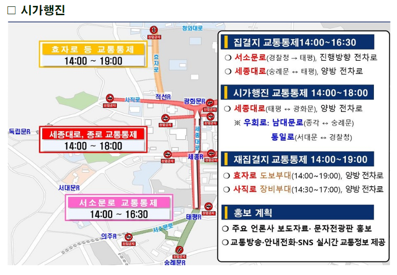 - 경찰은 종로1가에서 숭례문까지의 남대문로 구간과 서대문에서 의주로까지의 통일로 방향으로 차량을 우회하도록 안내할 예정입니다. 이로 인해 해당 구간을 지나는 차량은 사전에 우회로를 확인하고, 도로 혼잡을 피하기 위해 대중교통을 이용하는 것이 권장됩니다.