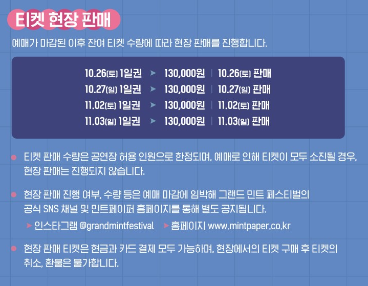 - 밴드 다기를 막기 위한 방안으로 최종 라인업 공개 이후 우선입장권이 판매될 예정입니다. 우선입장권 관련 내용은 추후 그랜드 민트 페스티벌 공식 SNS 채널 및 민트페이퍼 홈페이지를 통해 별도 공지됩니다.