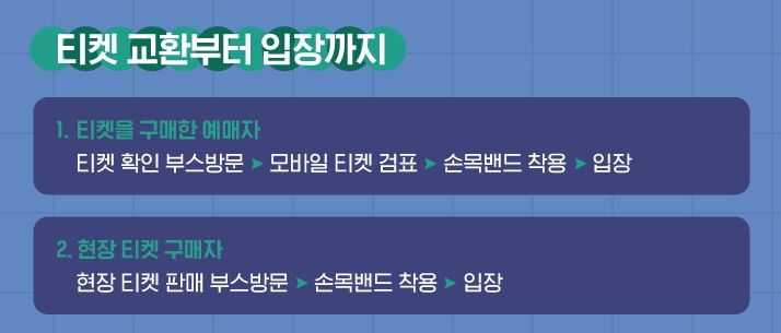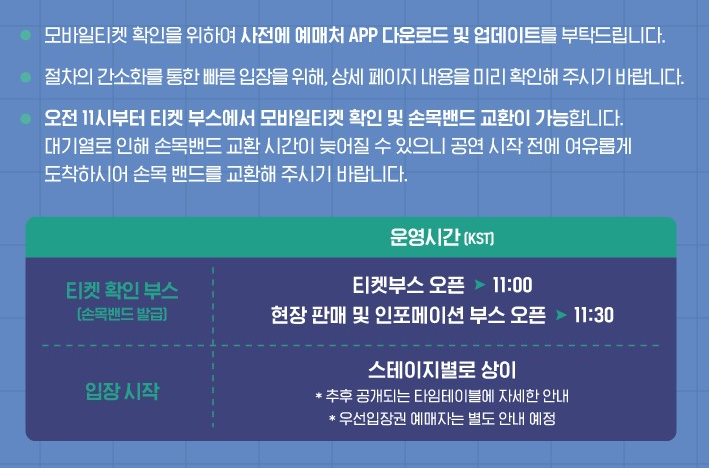 - 유효한 실물 신분증과 모바일티켓을 반드시 지참하여 손목밴드 부스를 방문해 주시기 바랍니다. 어떠한 사유로도 모바일티켓과 실물 신분증이 없을 경우 손목밴드 교환 및 입장이 불가하며, 이로 인한 취소/교환/환불은 불가합니다.