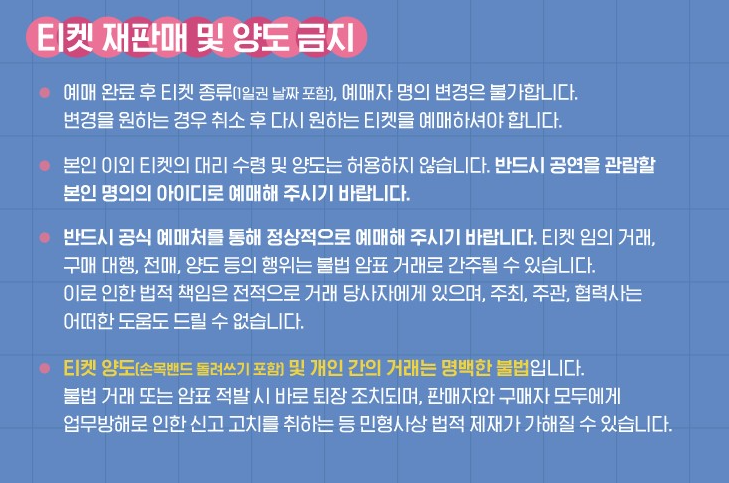 - 티켓 양도(손목밴드 돌려쓰기 포함) 및 개인 간의 거래는 명백한 불법입니다. 불법 거래 또는 암표 적발 시 바로 퇴장 조치되며, 판매자와 구매자 모두에게 업무방해로 인한 신고 등 민형사상 법적 제재가 가해질 수 있습니다.