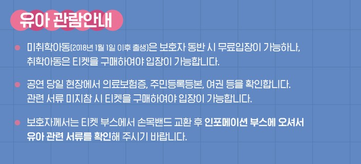 - 입장 손목밴드 교환 시, 모바일티켓과 예매자 실물 신분증을 반드시 지참해 주시기 바랍니다. (신분증 내 사진으로 인물 식별이 가능해야 합니다.)