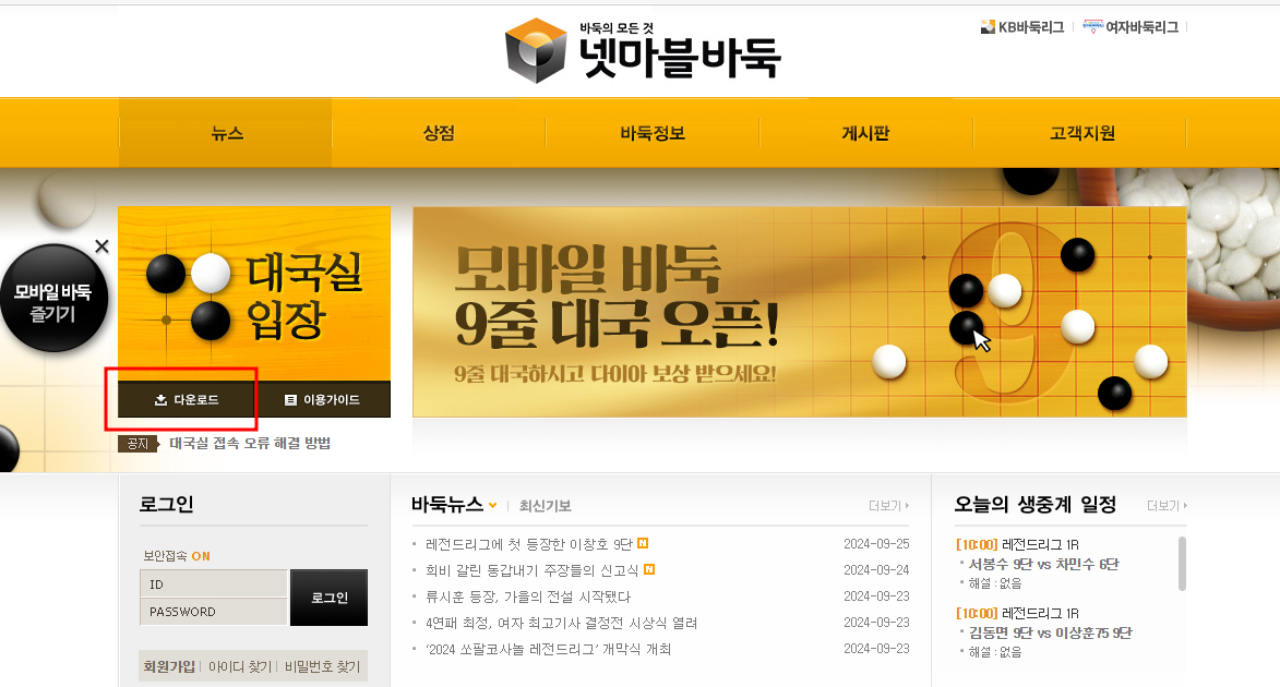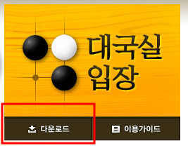 홈페이지 상단에 있는 '대국실 입장' 메뉴 아래에 위치한 ‘다운로드’를 클릭하세요. - 다운로드 버튼 클릭