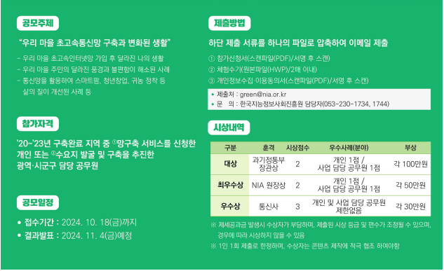 이번 공모전은 농어촌 지역 주민뿐만 아니라, 통신망 구축에 관여한 지자체 공무원도 참여할 수 있습니다. 특히, 초고속통신망 구축 서비스를 신청한 개인이나 해당 사업을 지원한 지자체 공무원이 공모 대상입니다.