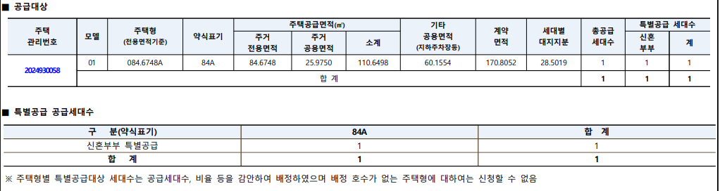 - 공급 규모: 지하 4층, 지상 47층, 총 4개동(그중 1개동은 오피스텔 포함)으로 구성되며, 총 498세대 중 계약취소주택으로 전용면적 84A타입 1세대가 공급됩니다. 이 1세대는 신혼부부 특별공급 대상입니다.