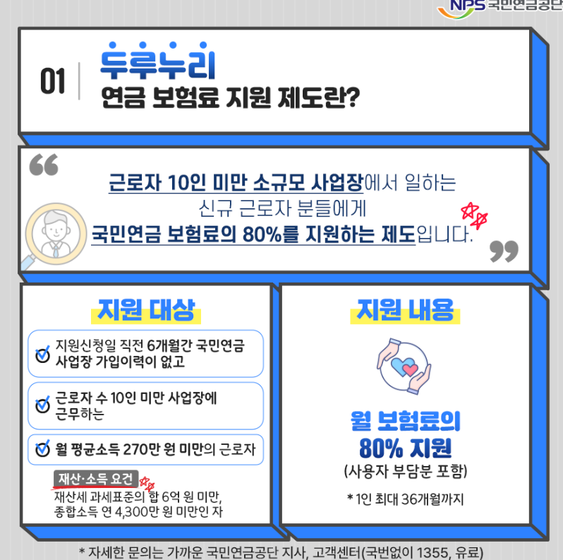 | 두루누리 보험료 지원 | - 10인 미만 사업장에 근무 - 월평균 소득 270만 원 미만 - 신청일 직전 6개월간 국민연금 가입 이력이 없는 자 |