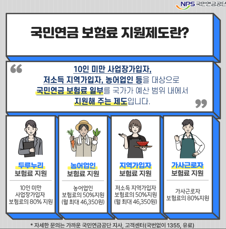 국민연금 보험료 지원제도를 통해 사회보험료 부담을 줄이고 안정적인 노후를 준비하세요. 자세한 내용은 가까운 국민연금공단 지사 또는 고객센터(1355)로 문의하시기 바랍니다.