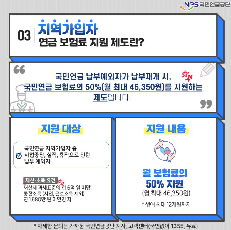 국민연금 보험료의 50% 지원 (최대 월 46,350원) | 최대 12개월 | - 국민연금공단 홈페이지, 모바일 앱 ‘내 곁에 국민연금’ - 국민연금공단 지사 방문/전화/우편/팩스 |