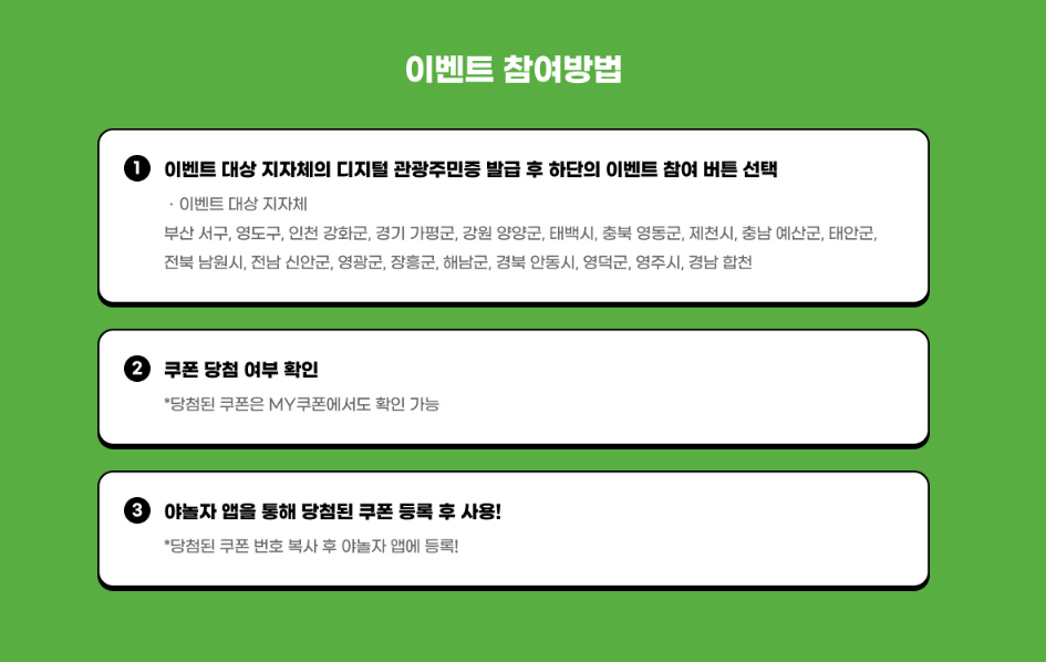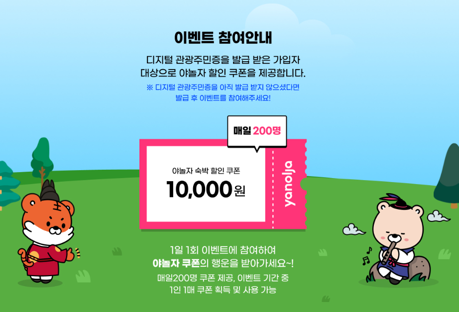 디지털 관광주민증 발급받은 후에 이벤트 참여가 가능합니다. 기간 내에 디지털 관광 주민증 발급받으시고 야놀자 숙박쿠폰 이벤트 혜택 놓치지 마세요~!!