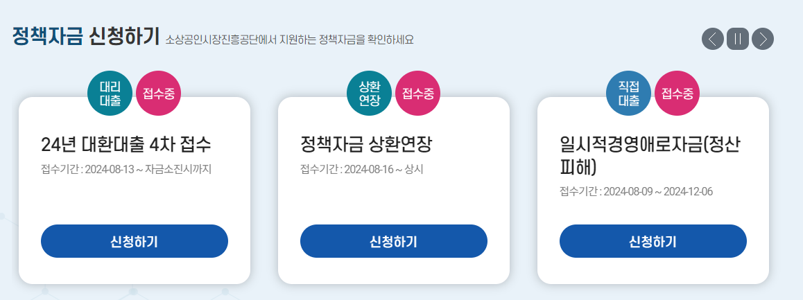 - 신청 접수: 2024년 8월 16일부터 소상공인 정책자금 상환연장은 상시 접수 가능합니다.