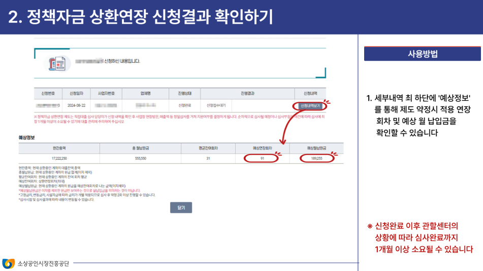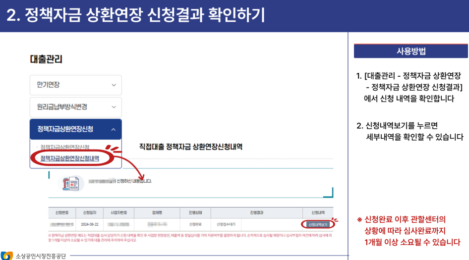 - 승인 및 약정 체결: 소상공인 정책자금 상환연장 지원 승인이 완료되면 약정 체결 후 대출이 실행됩니다. 약정 체결 전까지 기존 대출에서 발생한 이자는 약정 직전까지 수납해야 합니다.