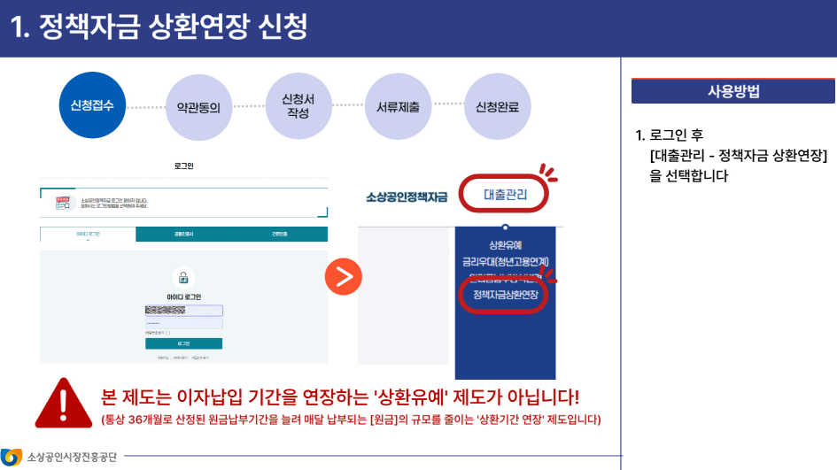- 소상공인정책자금 사이트 로그인 후 [대출관리 – 소상공인 정책자금 상환연장]을 선택하여 신청할 수 있습니다.