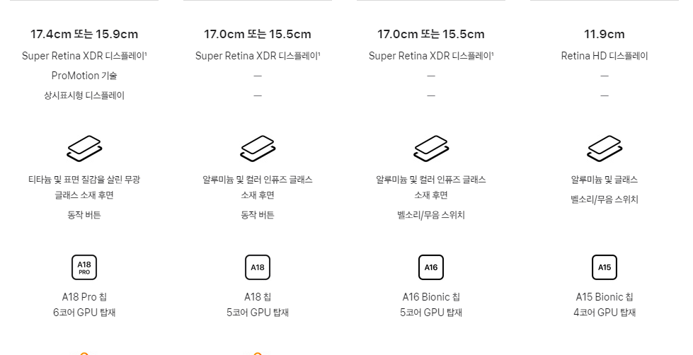 아이폰 16 시리즈는 모델에 따라 디스플레이 크기가 다르게 적용되었습니다.