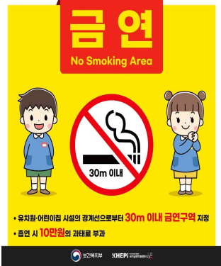 이외에도 이번 금연 구역 확대 및 신설 조치는 1년의 유예 기간을 거쳐 본격 시행되는 것으로, 간접흡연으로부터 아동 및 청소년을 보호하기 위한 노력의 일환입니다. 따라서 각 시·군·구청은 어린이집, 유치원, 초중고교 시설의 경계 30m 이내를 금연 구역으로 표시하는 표지를 건물 담장, 벽면, 보도 등에 설치해야 합니다.
