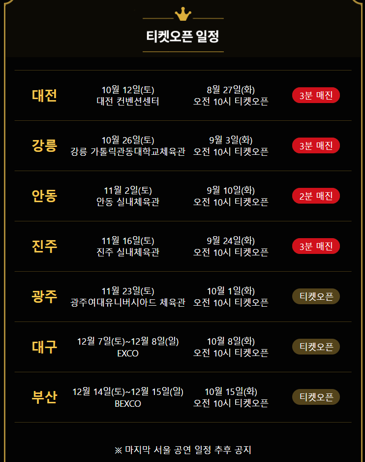 나훈아 공연 하반기 일정이 나왔습니다. 대전을 시작으로 강릉,안동,진주 를 시작으로 부산에서 마무리하고 서울공연을 끝으로 콘서트 일정이 마무리 됩니다. 진주공연까지는 티켓이 오픈하고 3분만에 바로 매진이 됐네요. 나머지 광주 이후 콘서트 티켓오픈일정 정보 공유드립니다.