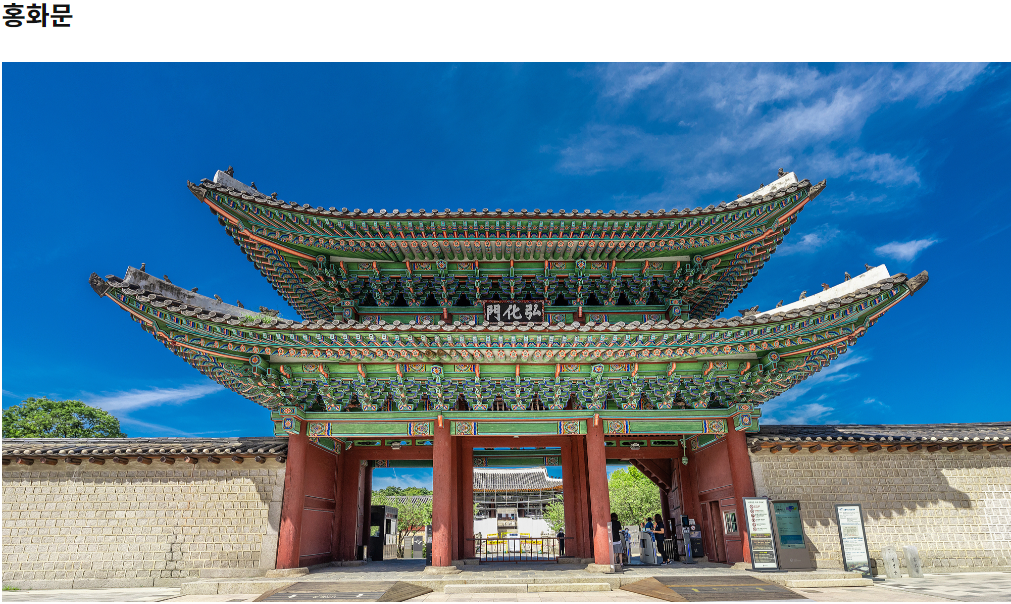 홍화문(弘化門)은 창경궁 창건 당시에 처음 건립되었다가 임진왜란 때 소실되어 1616년(광해군 8)에 재건되었다. 같은 동궐인 창덕궁의 정문(돈화문)은 앞면이 5칸인데 비해 홍화문은 3칸의 작은 규모로 지었다. 정조는 1795년(정조 19) 어머니 혜경궁 홍씨(헌경황후)의 회갑을 기념하여 홍화문 밖에서 가난한 백성들에게 쌀을 나누어 주었다고 한다.
