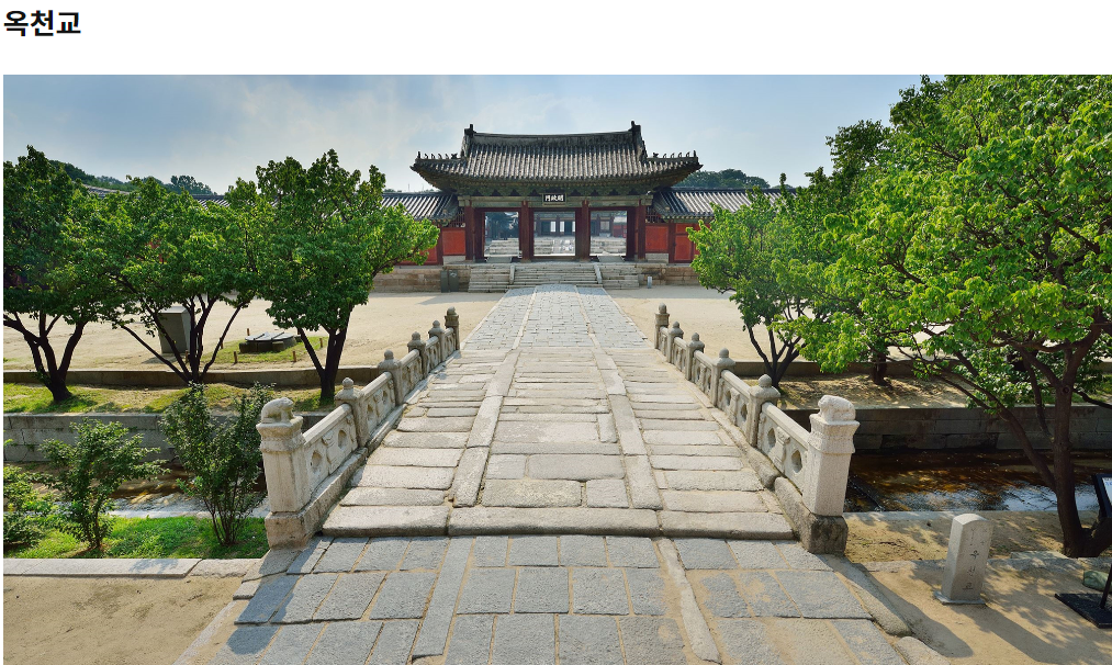 옥천교(玉川橋)는 응봉산의 명당수가 창덕궁의 존덕정을 지나 창경궁의 북쪽 춘당지를 거쳐 옥천교로 흘러 남쪽으로 흘러간다. 다리 양쪽 아래에 아치(무지개) 모양 사이에는 도깨비 얼굴의 귀면이 조각되어 있는데, 이것은 물길을 타고 들어오는 귀신을 쫓아내어 궁궐을 보호하고 수호하는 의미를 가지고 있다. 옥천교는 궁궐에 남아 있는 다리 중 원형이 잘 보존되어 있다.